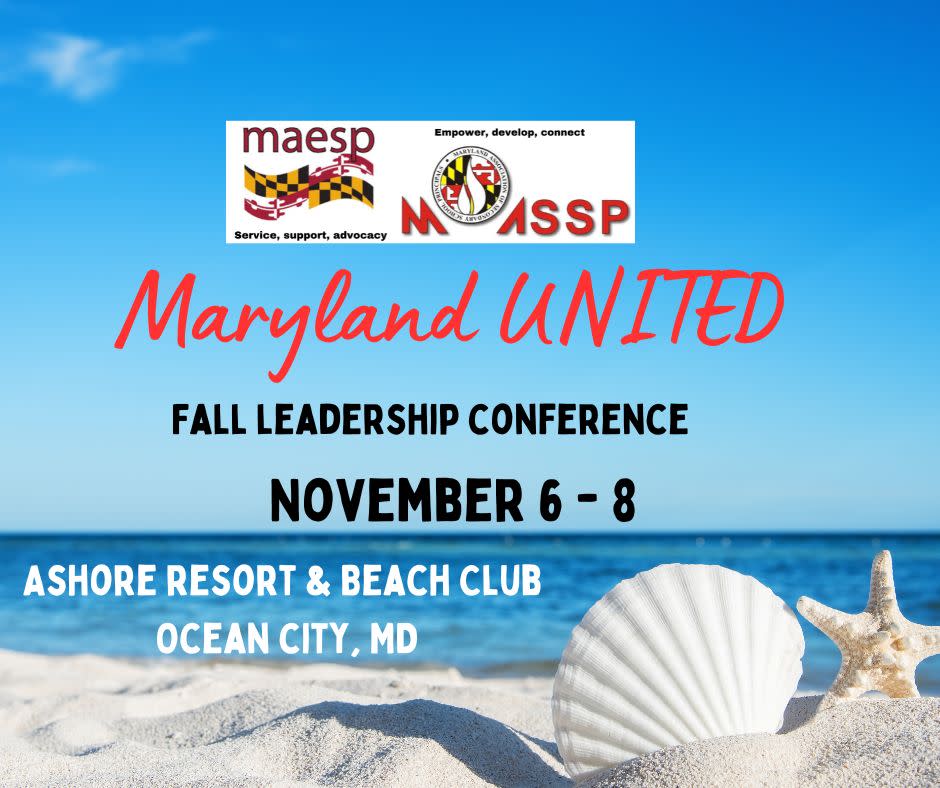 UNITED. This event is a collaboration with MASSP and will once again be held at the Ashore Resort & Beach Club in Ocean City. There will be many awesome keynote speakers and almost all of our concurrent session presenters are Maryland school leaders.